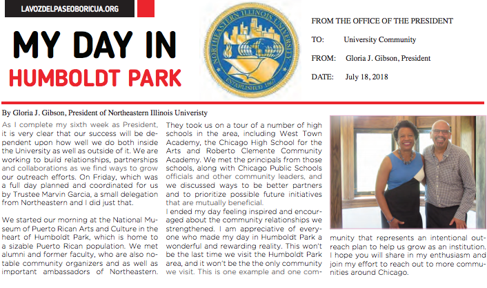 Newly appointed President of Northeastern Illinois University (NEIU) Dr. Gloria Gibson visited the Humboldt Park Community as part of a listening tour with community leaders and school administrators participating in the Community as a Campus initiative. The goal of the visit was to see first hand the feasibility of building an NEIU presence in Humboldt Park to offer students education pathways with wraparound support provided by both the community stakeholders and NEIU to ensure post secondary retention and graduation.