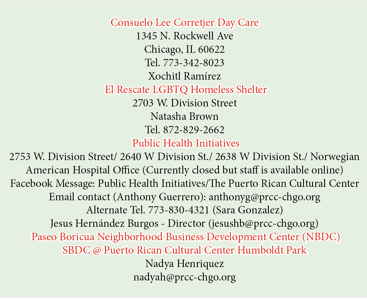 Additionally, the PRCC is supporting small businesses so that they can apply for emergency funds and loans that have become available through the City of Chicago, the U.S. Small Business Administration (SBA), and the Illinois Department of Commerce & Economic Opportunity (DCEO), as well as any other assistance for which they may qualify. This support is made available through the Paseo Boricua Business Development Association (NBDC) and the new Small Business Development Center SBDC @ at The Puerto Rican Cultural Center Humboldt Park, scheduled to open its doors in 2020. Support is being made available via phone and email. If you require or have questions about any of the following services, please contact the programs during regular business hours.